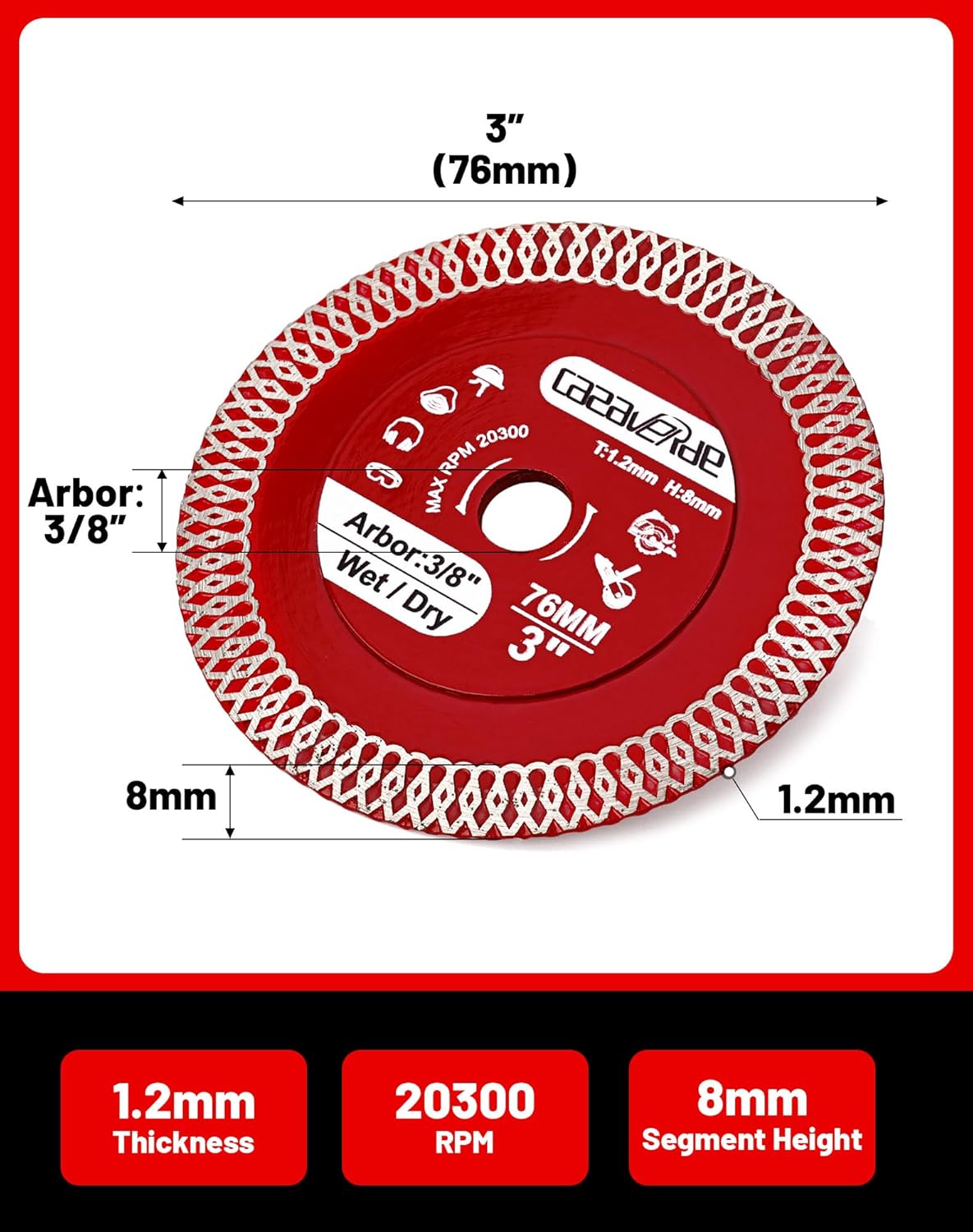 • Super thin turbo mesh rim diamond blade provide fast, precise, smooth and chip-free cutting experience for you.