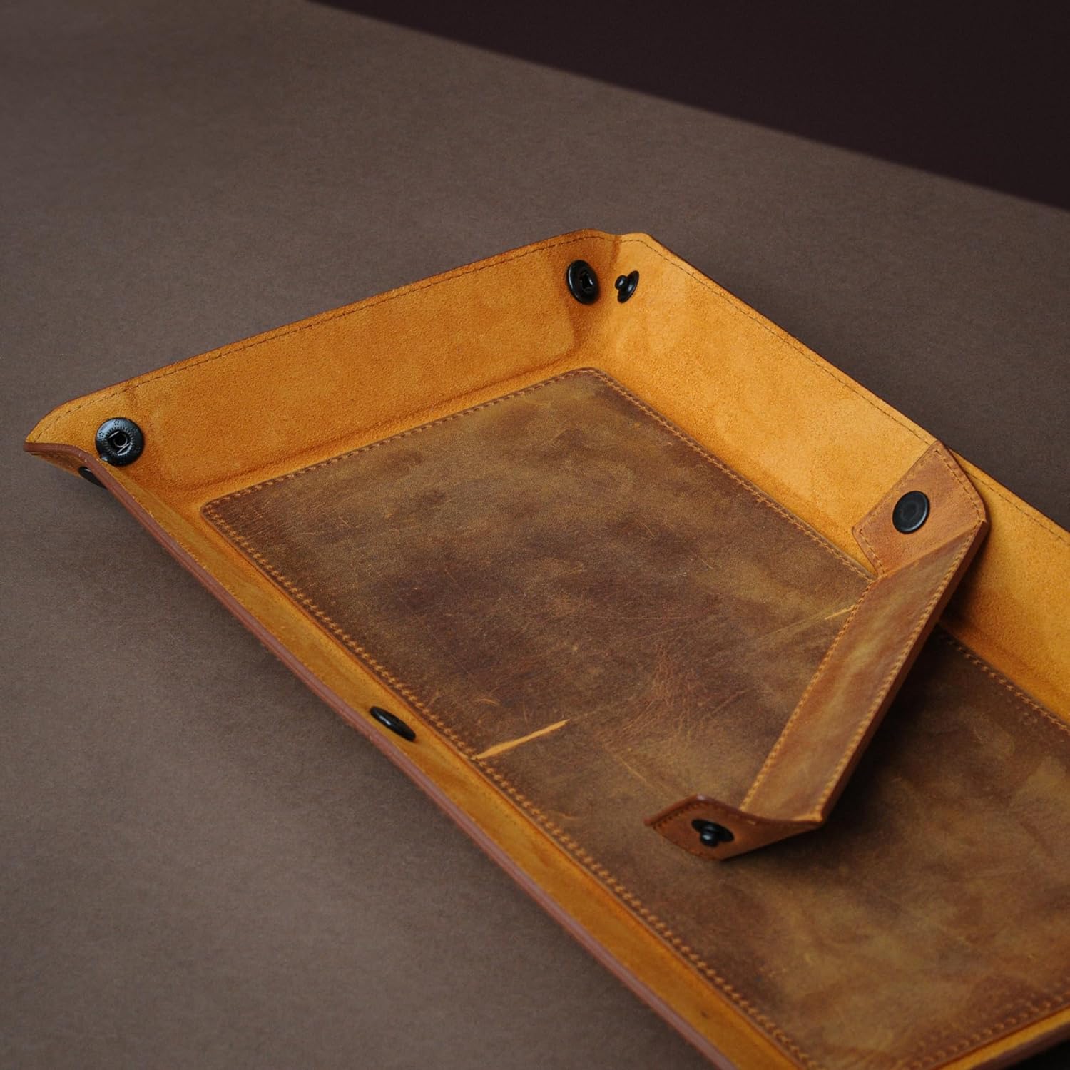 This leather tray is handcrafted from high quality full grain leather that offers a soft and gentle touch as well as a chic appearance in your house. Furthermore, it is available in various colors (black, brown, camel, dark brown, green, gray, red, and purple) and sizes (small, large and rectangular) for different purposes. Additionally, we can personalize your leather tray with initials or logo so that you can make it a perfect new neighbor gift for your new-coming neighbors.
