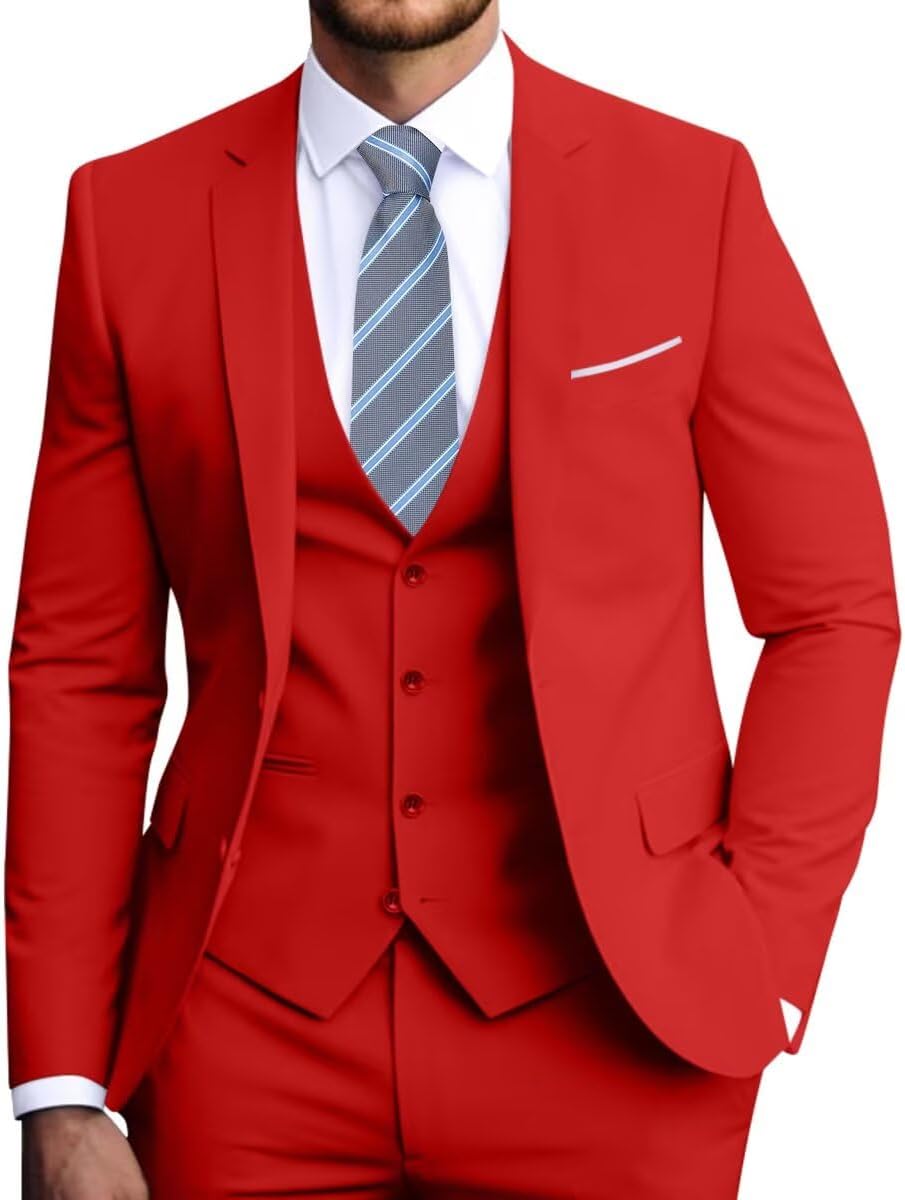 Men's Suit Slim Fit 3 Pieces Suits Wedding Groomsmen Tuxedos Business Prom Party Homecoming Tuxedo Suit Men Blazer Jacket Vest Pants with Tie Suit Set Package include: 1*Suit Vest, 1*Suit Pant, 1*Suit Blazer, 1*Tie as Present. Color: Navy Blue, Black, Grey, White... Style: Classic Design, Slim Fit, Simple and Fashion, Casual Formal Pattern Type: Solid Details: 2 Button, Pocket Pants & Tops Material: Viscose,Polyerter Suit Blazer 1. Pocket with White Edge for Decoration. 2.2 Real Flap Pockets 3. 3 Inner Real Packets. Suit Dress Vest 1. V-neck. 2. Fake Chest Pocket for Decoration. 3. 2 Real Outer Pockets: Before using these two pockets you will need to unstitch the other half inside, please be careful not to cut the suit. 4. Adjustable Back Strap. Suit Pants 1. Safety Double Buckle Design. 2. 2 Side Slash Pockets. 3. 2 Back Practical Pocket. 4. Micro-elastic Waist. Occasion: Ideal for formal and informal occasions, suitable for Weddings, Graduation ceremony, Dating, Daily life, Prom, Meeting, Work, Business, Yacht party, holiday,social gathering and any Celebration. Perfect for your family members or boyfriends when the Christmas, New year, Valentine's Day, Birthday, Father's Day, etc. Notes: 1.There would be within1 inches size difference due to different manual measurement. 2.The colors might look slightly different from the picture due to different cameras and monitor settings. 3.The standard size chart is the finished suit size . It should be bigger than body measurement.