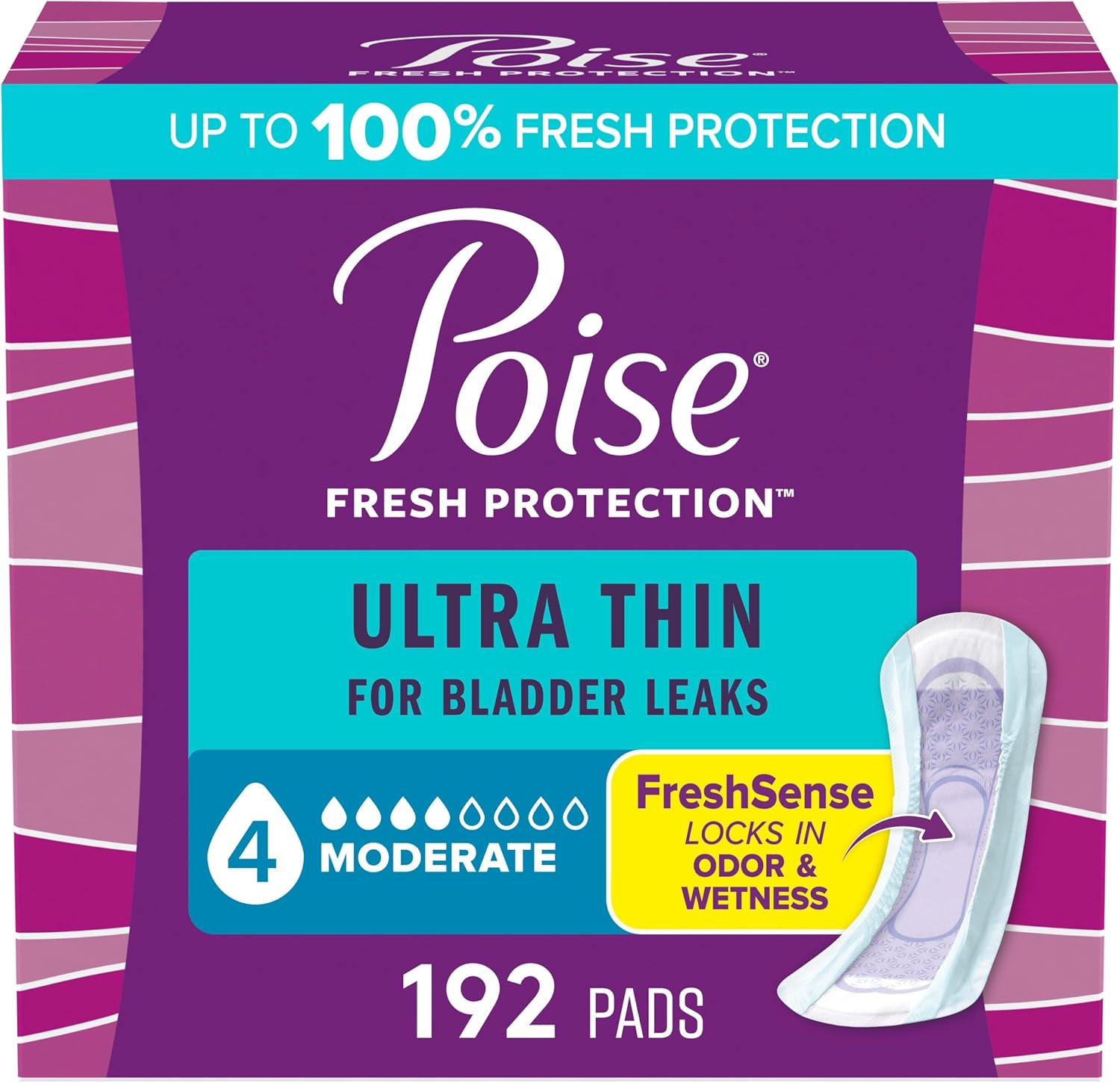Enjoy up to 100% clean, dry and fresh protection with our thinnest incontinence pad, Poise Ultra Thin Incontinence Pads. Unlike period pads, which are meant for menstrual needs, Poise pads are designed to offer protection specifically against light bladder leaks. In fact, Poise bladder control pads have a Dry-Touch layer that rapidly locks away more* wetness for a clean feel and offer up to zero leaks. Plus, our disposable incontinence pads feature Leak-Block sides for dryness and outstanding protection. As our thinnest protection, each incontinence pad has a Thin-Flex design that holds its shape for all-day comfort. These women’s pads are made with breathable materials that let fresh air in to help eliminate dampness and keep you feeling clean and fresh. Poise incontinence pads are available in Light, Moderate, Maximum and Overnight absorbencies. For lighter absorbency needs, check out Poise Daily Liners. (*vs. leading period pads, 24 ml of fluid)