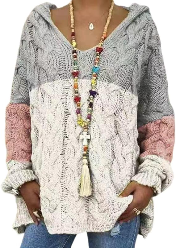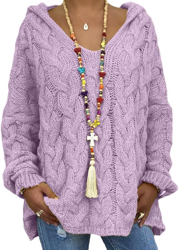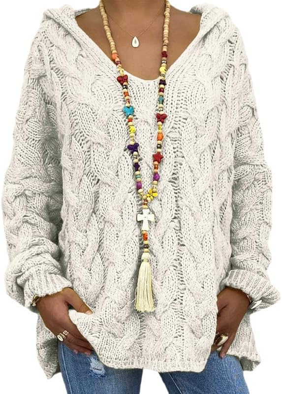 ZOCANIA Hoodie Sweaters for Women Cable Knit Womens Chunky Sweater V Neck Long Sleeve Oversized Hoodies Solid Color Drop Shoulder Casual Fall Outerwear Pullovers