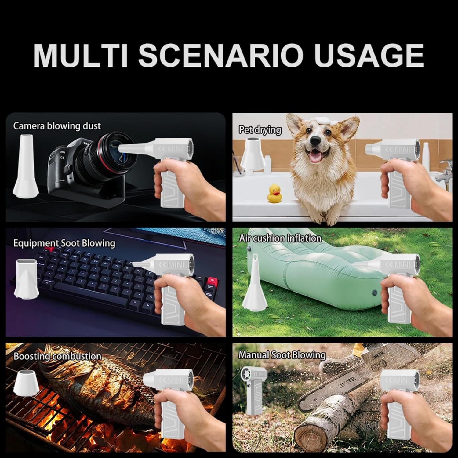 Blower With 5 Nozzles And 10 Brushes 105000RPM Brushless Motor 4 Speed Settings 4000mAh Remover For Home & WorkshopFeatures:unparalleled power with the high speed blower, featuring a brushless motor reaching 105000rpm for 41m/s windspeed, 4 speed settings, and a 4000mah battery for extended leaf blower and blower tasks.Engineered with abs construction and rotating latches systems, this 208g handheld blower includes 5 nozzles and 10 brushes for various cleaning across electronics, workshops, and outdoor gear.Ideal for DIYer enthusiasts, pet owners for precise tasks like camera maintenance, BBQ ignition, or inflatable gear.Tackle in tight spaces, accelerate campfires flame, dry furry companion after baths, or clear workshop debris with this multifunctional high speeded blower's adjustable winds pressure.Its 135g winds pressure outperforms bulkier models while maintaining quiet operatiosn for indoor/outdoor blower applications.Specifications:Component:ABSName: X3S Violent Fan Color: As Picture ShownMaximumly Speed: 1050000RPM Maximumly Winds Speed: 41m/s Battery Capacity: 4000mAh Configuration: Five winds nozzles + 10 brushes, which can be easily disassembled and used to meet the needs of different scenarios.Package Includes:1 Set Air BlowerNote:1.Please allow 1-2cm errors due to manual measurement, make sure that you donot mind befores you order. 2.Due to the differences between different monitors, the picture may not reflect the actual color.Thanks for your understandings.