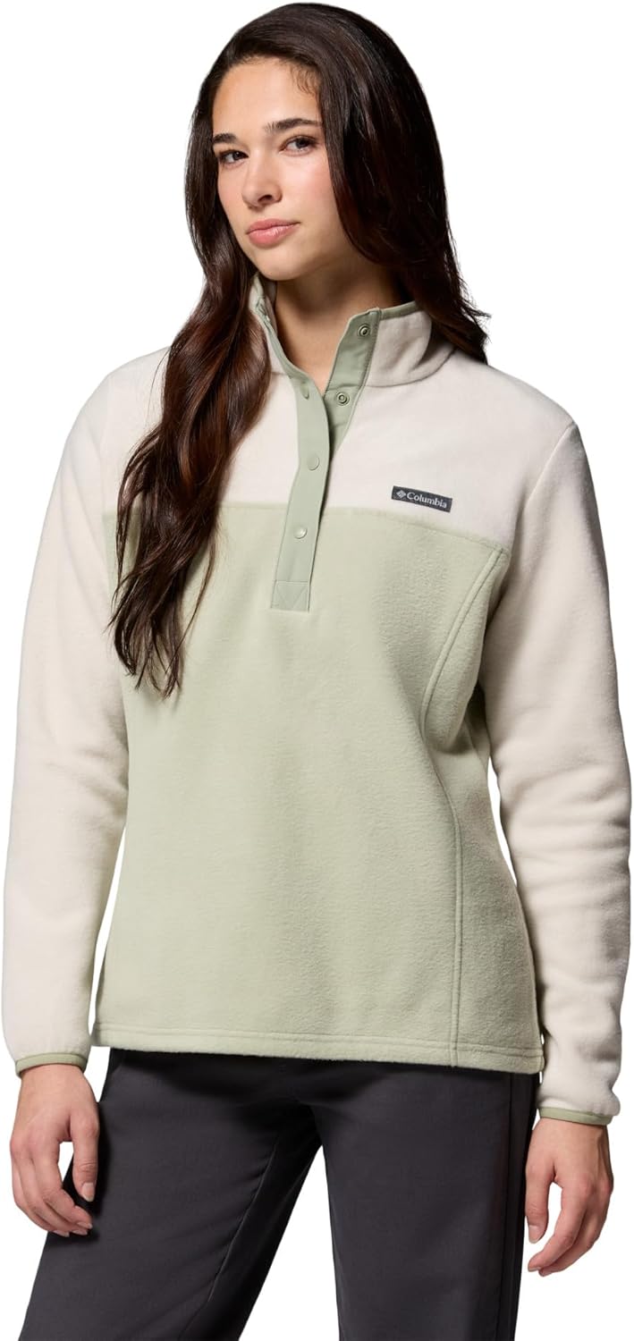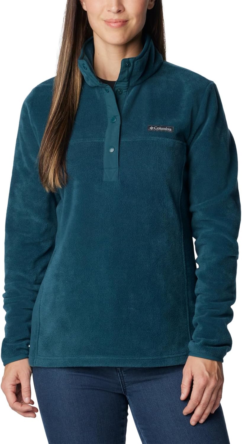 The Columbia Women’s Benton Springs Half Snap Pullover is a cozy fleece coat made from plush 250g fleece with an active waist cut silhouette. This fleece layer is a must for any winter wardrobe and can be worn on its own for cool chilly days, or as mid layer with an outer shell for the ultimate in cold weather protection. It is a winter-ready staple perfect everyday style and warmth. You're bound to be warm and worry-free in this fleece jacket crafted of our super-soft 100% polyester deep 250g MTR fleece. It's the perfect layering piece and first line of defense to combat the cold, and as an added bonus, the warm collar is flexible enough to wear up or down, depending on your desired level of toastiness. Columbia offers this fleece jacket in a wide range of colors and sizes. Available in extended sizing. Regular Fit. To ensure the size you choose is right, utilize our sizing chart and the following measurement instructions: For the sleeves, start at the center back of your neck and measure across the shoulder and down to the sleeve. If you come up with a partial number, round up to the next even number. For the chest, measure at the fullest part of the chest, under the armpits and over the shoulder blades, keeping the tape measure firm and level. Imported. Made from 100% polyester. Snap closure. Machine Wash.