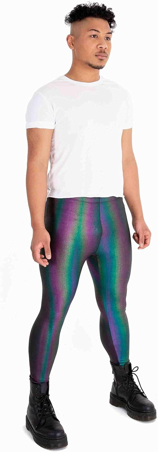 Kapow Meggings Metallic Leggings, designed to fit like a second skin and look like a million dollars. Each style is engineered with 4-way stretch for comfort and flexibility no matter your body shape, an ergonomic waistband for a snug and secure fit, and premium high-stretch spandex and polyester fabric that’s lightweight and supremely comfortable. These are men’s leggings made to stand out, not fit in. Designed to supercharge your street style, they’re also comfortable enough to wear around the house. Guaranteed to turn heads. These styles are designed to dazzle your friends on the dancefloor. The perfect shiny pair of leggings to wear to your favourite music festival or gig; or whilst hanging out with friends. Our Metallic Leggings come in a host of different styles with varying degrees of shininess to suit your specific needs and taste. Despite their metallic look, our Metallic Leggings are lightweight and designed to minimize the risk of overheating; even if you are wearing them to dance all day at a festival or party! - Metallic Look Men's Leggings - Perfect For Parties' & Festivals - Unique, Head-Turning Styles - Fade & Stretch Resistant Our Men's Leggings are designed with men in mind. They are made for men, by men. Despite being strong enough to resist stretching or wearing out after repeated use; our leggings are also designed to be incredibly comfortable; fitting the shape of the user so as not to restrict leg movement in anyway or risk elastic causing discomfort. They look great at festivals but are also ideal for casual wear and streetwear. Hand wash cold and hang dry to best care for your new leggings. They are not suitable as activewear or gym gear, or for strenuous activity. If you like our Metallic Men's leggings, check out our other unique ranges of Kapow Meggings leggings for men. We offer designs that are great for parties and raving as well as styles for intense physical activity.