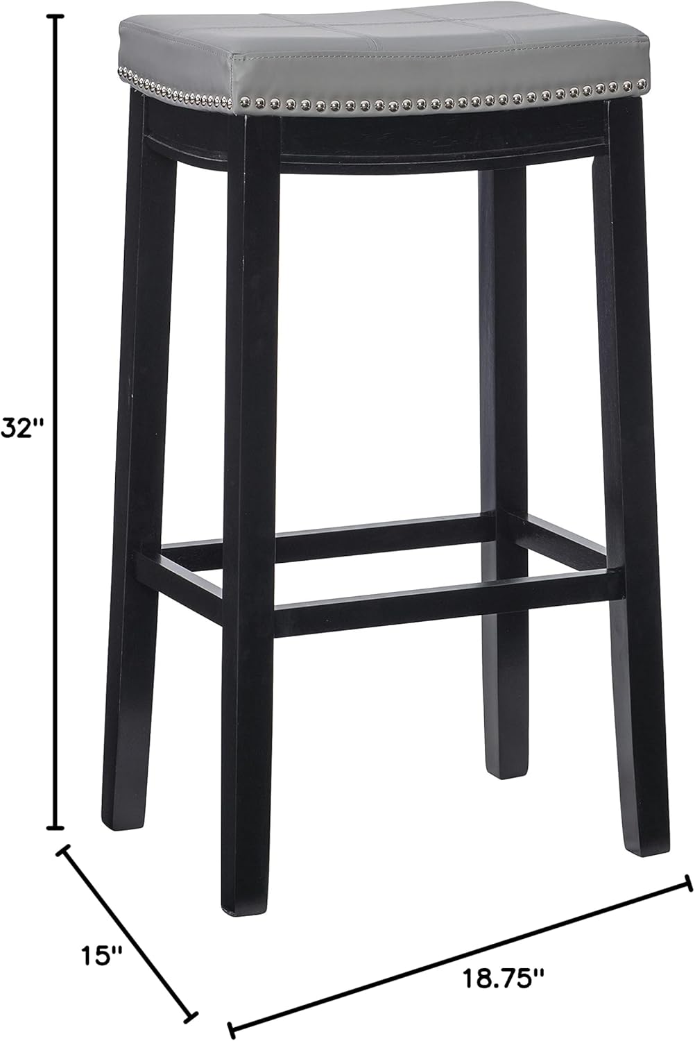 This grey bar stool will add stylish seating to any counter or high top table in your home. The sturdy wood frame has a black finish accented by a grey faux leather seat. Silver nailhead trim and double needle accent stitching adds durability to the padded top for an eye catching detail. 32.25" seat height. 275 pound weight limit.