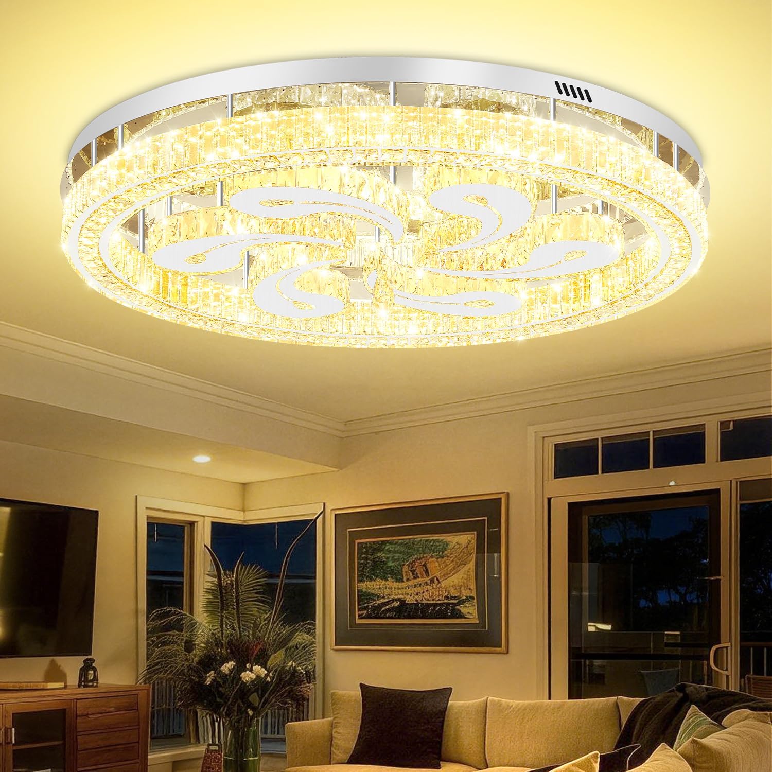 Modern Crystal Chandeliers for Dining Room Flush Mount Ceiling Chandelier for Living Room Dining Room Ring LED Crystal Ceiling Light (Round,40in Silver,Dimmable 2700K-6500K)
