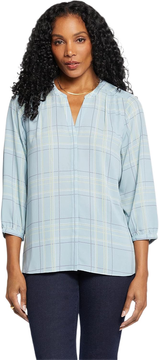 NYDJ's pin tuck pleat back women's blouse boasts a billowy long sleeve silhouette that's perfect when paired with any of our slimming women's denim styles. Pleating at the back yoke creates a sophisticated yet easy drape. Split round neckline with covered full front placket and button closure.