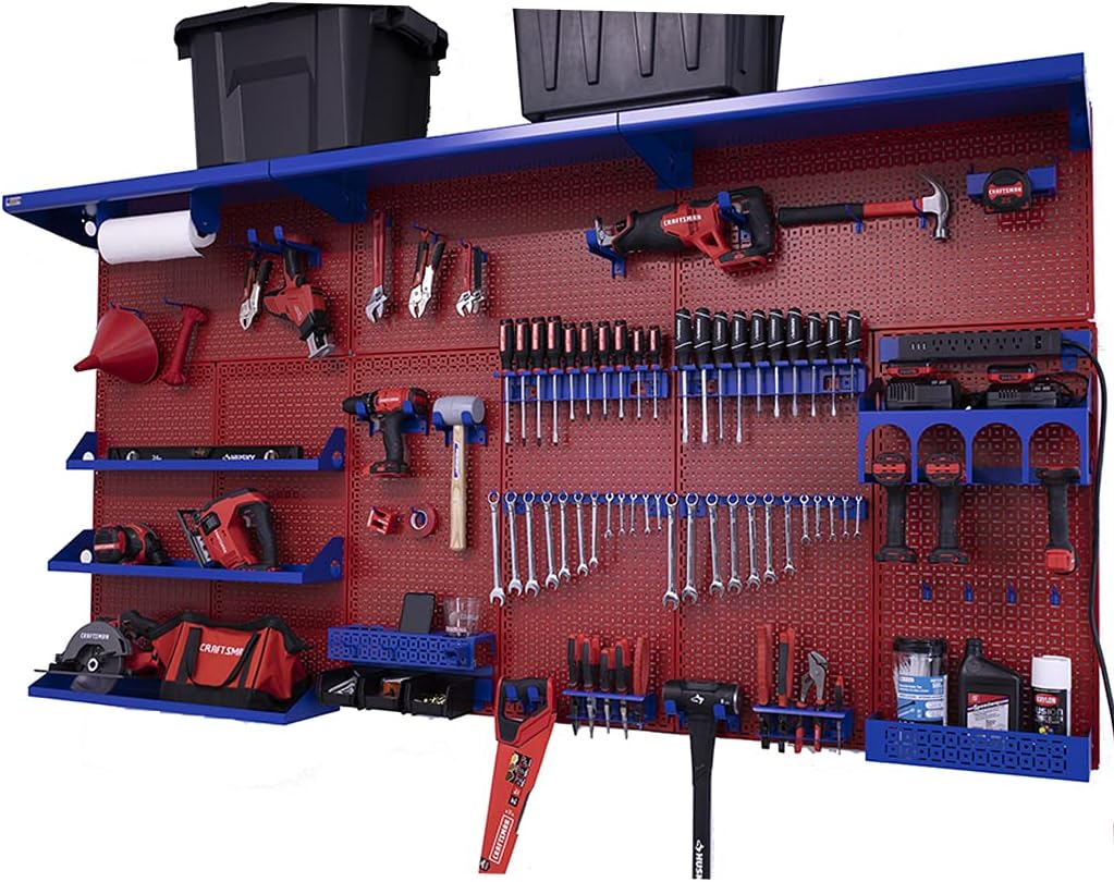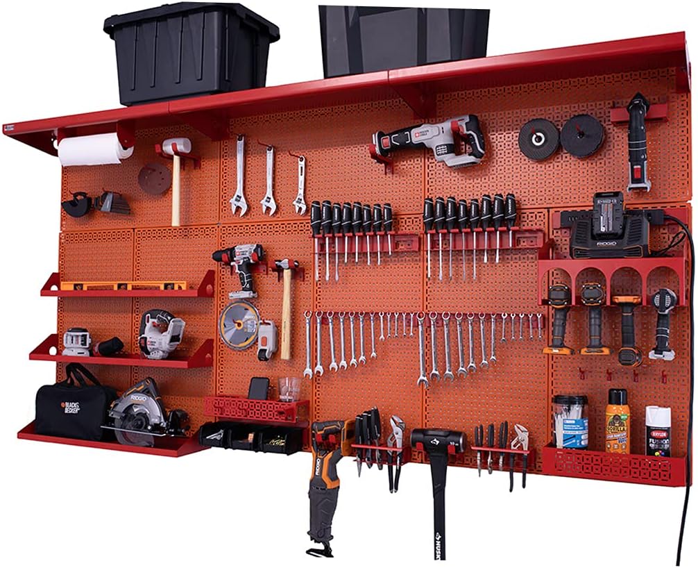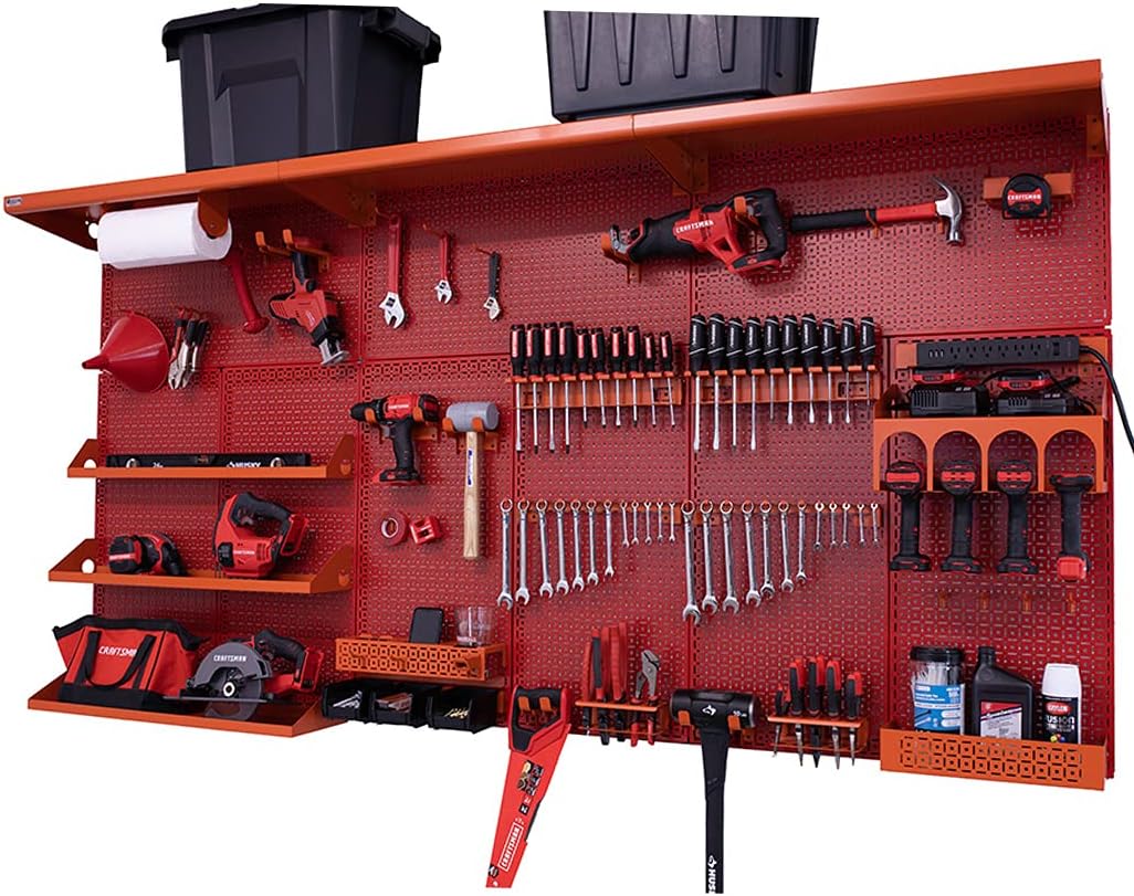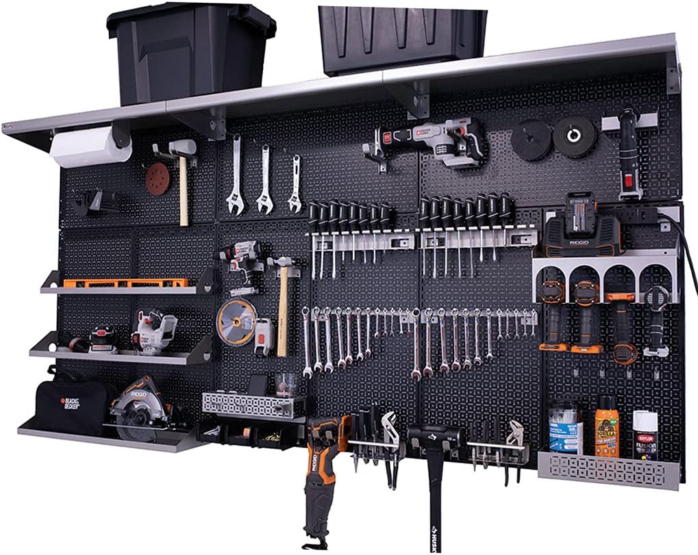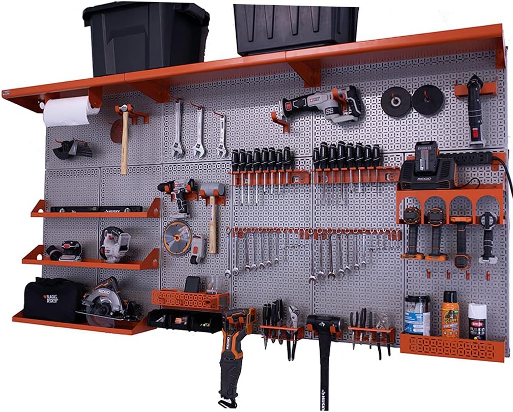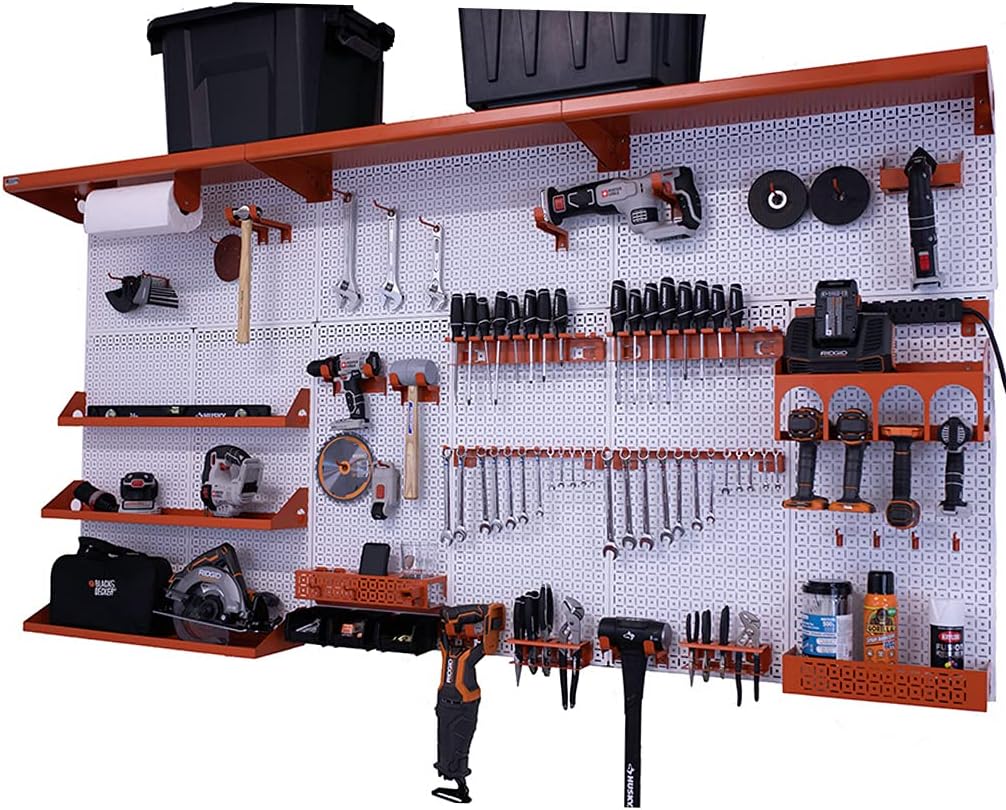 PATENTED DESIGN – OmniWall’s wall storage system is your ultimate tool and accessory organizer. The panels are designed to hang horizontally and vertically, which allows you to use it on any wall. Anywhere you choose to position the workbench kit is suitable. ENDLESS STORAGE - The Weekend Warrior XL is 8 feet wide and 4 feet tall, and has over 30 different accessories giving you endless organization options. EASY INSTALLATION – all accessories are one solid piece and are guaranteed to clip into the panel steadily without falling off. Pefect for keeping your tools stored and secure to our panels. ROOM TO GROW - With already over 30 accessories provided to you there is still plenty of room to expand your wall and make your garage or shop an organized paradise. This is our largest wall organization kit! A quantity of nine (9) 16" x32" 18 gauge galvannealled powder coated metal panels with the strongest and most superior tool storage accessories on the market. Our Weekend Warrior XL Kit is the wall organization system for the home improvement enthusiast and the master automotive technician who works on all family and friends vehicles every weekend. Made in the USA. In addition to the nine (9) 16” x 32” panels, three (3) 32” long x 12” deep top shelves, five (5) other shelves and so many superior strength accessories that will astonish all your family and friends. Our large garage organization wall for tools has a four pack of small peg board hooks, 2 packs of four medium peg board hooks and also a four pack of large peg board hooks. Additionally there are eight serious hooks for hanging heavy tools. Be the first in your neighborhood to showcase your tools with the very best wall organization solution on the market. Product Includes (9) 16" x 32" OmniPanel (6) 32" Top Wall Cleat (3) 32" Bottom Wall Cleat (1) Multiple Drill/Impact Shelf Kit That Includes Impact Shelf 8"x16" (1) Magnetic Paper Towel Holder (2) Single Set Screwdriver Holder (2) Single Set Wrench Holder (2) Plier & Clamp Holder (1) Impact Shelf 4"x32" (1) Impact Shelf 6"x32" (1) Impact Shelf 8"x32" (3) Top Shelf 12" deep x 32" long (1) 5" x 3" x 16" All-Purpose Shelf (2) 4-Pack of Short Wire Hooks (2) 4-Pack of Medium Wire Hooks (4) Short Serious Hooks (4) Medium Serious Hooks (1) Tablet & Phone Holder (1) Power Strip (1) Universal Tool Cradle (1) Universal Tool Cradle XL (1) Belt Clip Organizer (1) 3-pack of Plastic Bins (1) Grinder Holder Product Specifications Made in the USA, the Weekend Warrior XL Kit is configured with 48" top and bottom wall cleats to make a 96" Wide X 48" Tall Wall System. If your wall configuration differs, additional cleats may be purchased.