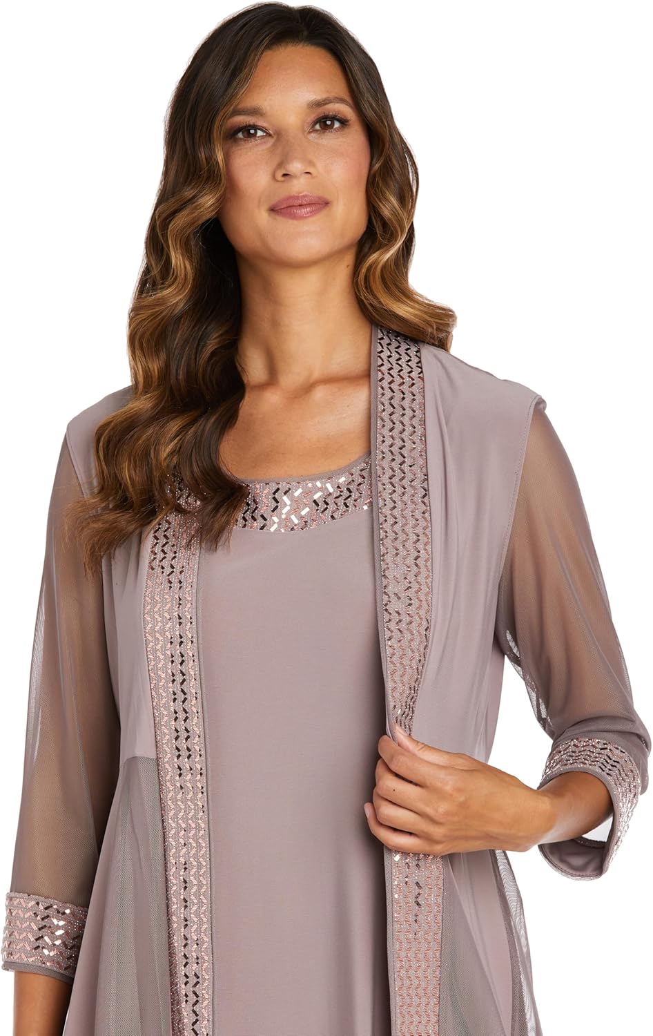 Step into elegance with this metallic jacket dress from R&M Richards, a beautifully tailored two-piece ensemble designed to turn heads. The fitted sheath dress features a stunning chevron pattern neckline that catches the light with every step-making accessories optional. Paired with a sheer, flowy 3/4 sleeve jacket, this look delivers graceful coverage while maintaining breathability and charm. Whether you're attending a wedding, a special church event or an evening celebration, this set effortlessly blends style and comfort. It's the dress you'll reach for when you want to feel confident, classy and unforgettable.