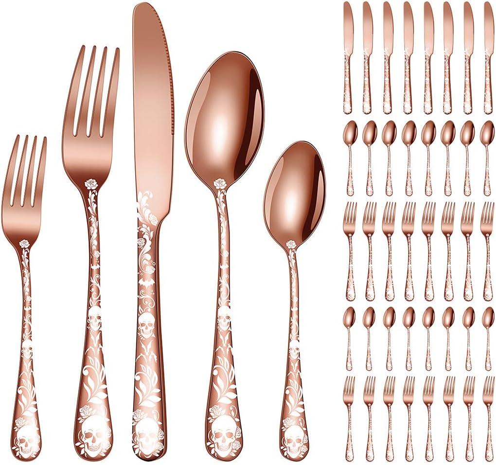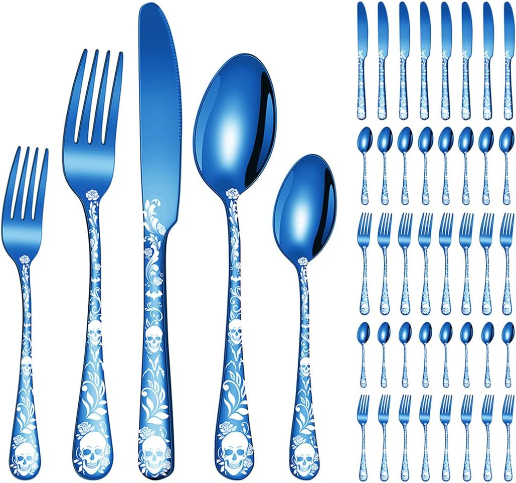 If you are looking for Halloween gift which might surprise you'll find it in here. The skeleton cutlery set is a collection of metal utensils that draw inspiration from Halloween themed. The set includes a dinner fork, dinner knife, and dinner spoon, perfect for use at Halloween parties or other themed events. With gothic skull , flower and bat pattern handles, these utensils exude a lifelike quality and add a unique decorative element to the dining table. This skull cutlery set adds a touch of macabre and whimsy to Halloween parties or themed events. Dinner Fork and Salad Fork 7.99" length. The size of the fork is perfect for everyday dining, and the front tines make it easy to pick up different foods without cutting your mouth. 6.89" length. The overall length of the fork and the size of tines are smaller, making it ideal for appetizers, vegetable and fruit salads, and for children tableware. Dinner Knife 8.86" length. The ergonomic handle has a proper thickness without sharp edges, very comfortable to use and cut, and the blade has the right sharpness for both adults and children. Dinner Spoon and Tea Spoon 7.99" length. Larger spoons are versatile in use even on their own, professional spoon bowl and handle design, very smooth surface, no sharp edges or rough points, will never hurt your mouth when used. 6.61" length. The spoon bowl is not big enough to get too much food at one scooping. The smaller size of the more suitable for dessert consumption or mixing tea, or for children as a dinner spoon. Package Include: 8 x dinner fork 8 x dinner knife 8 x dinner spoon 8 x salad fork 8 x tea spoon